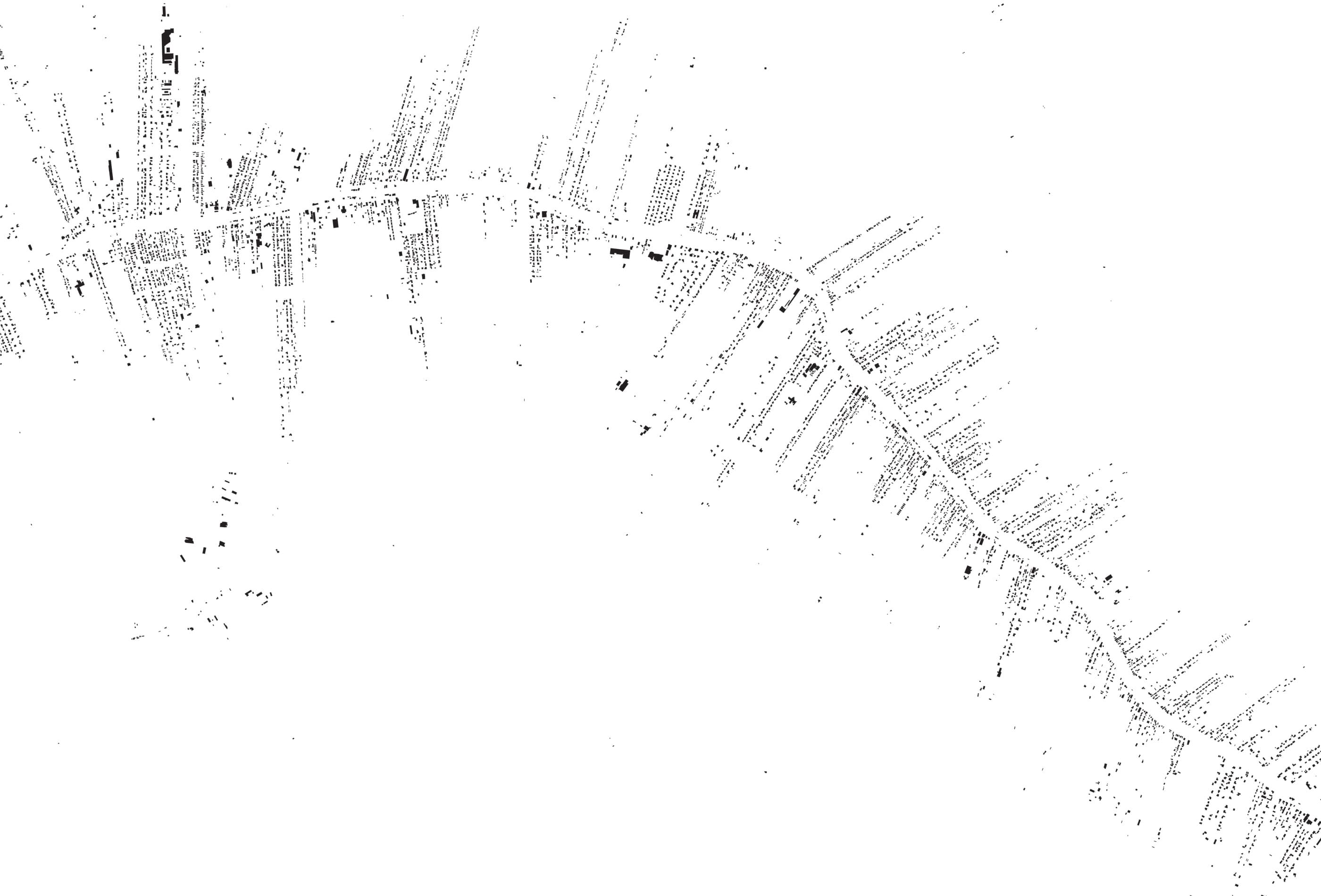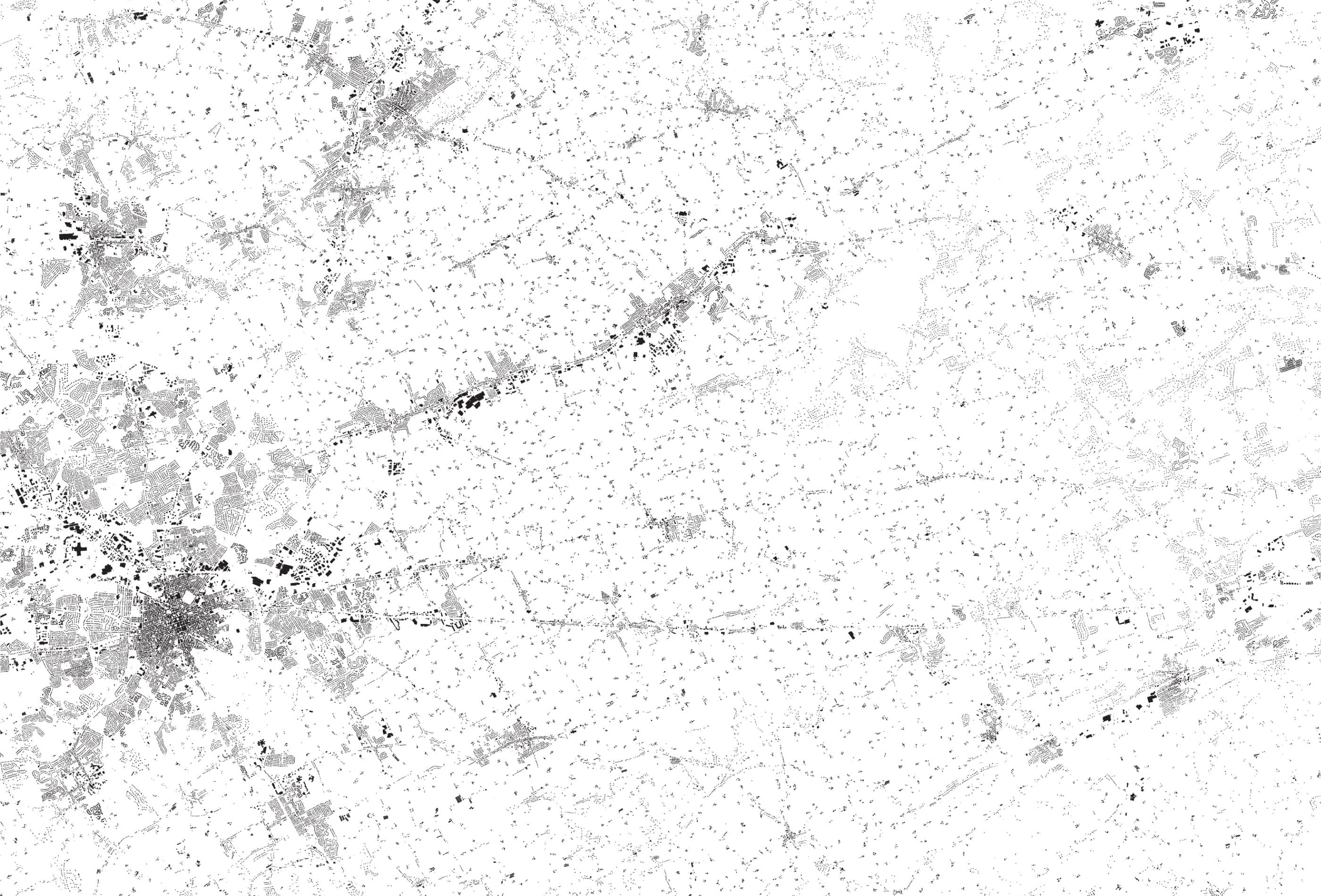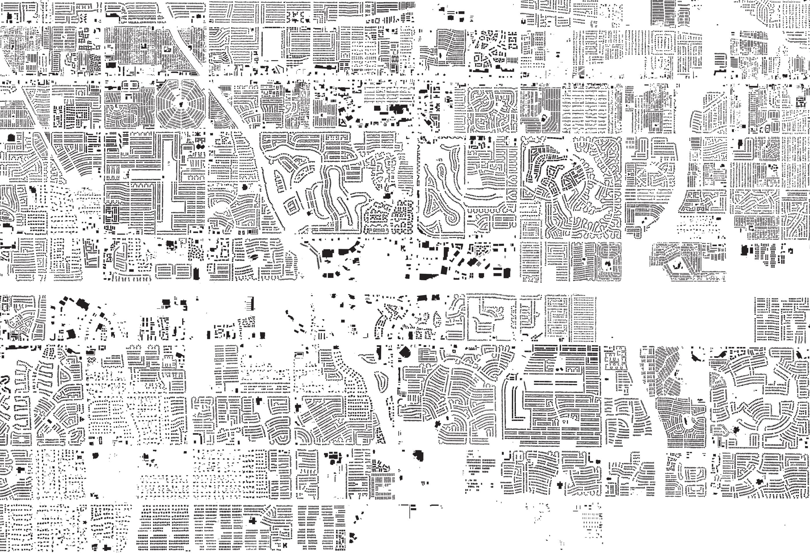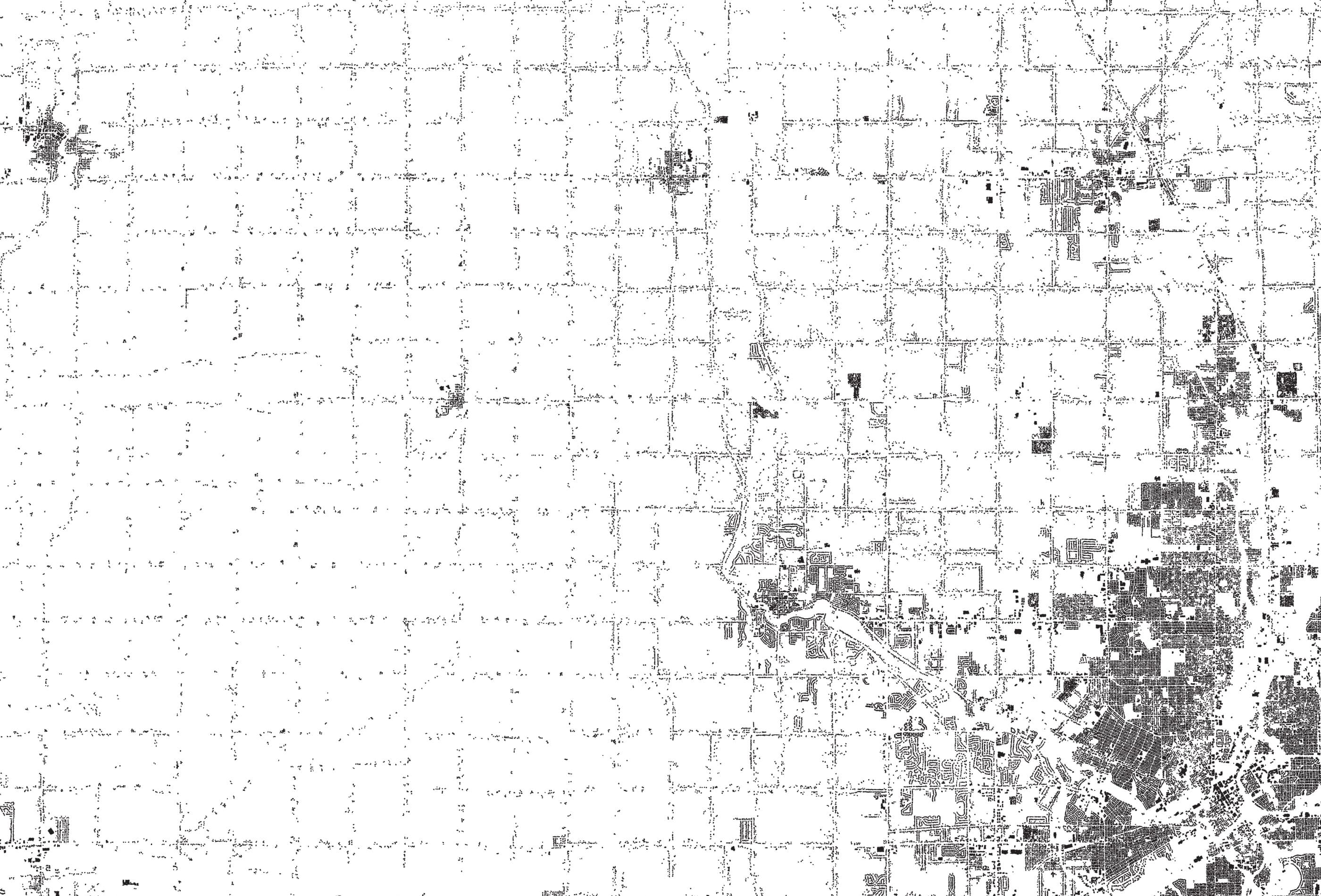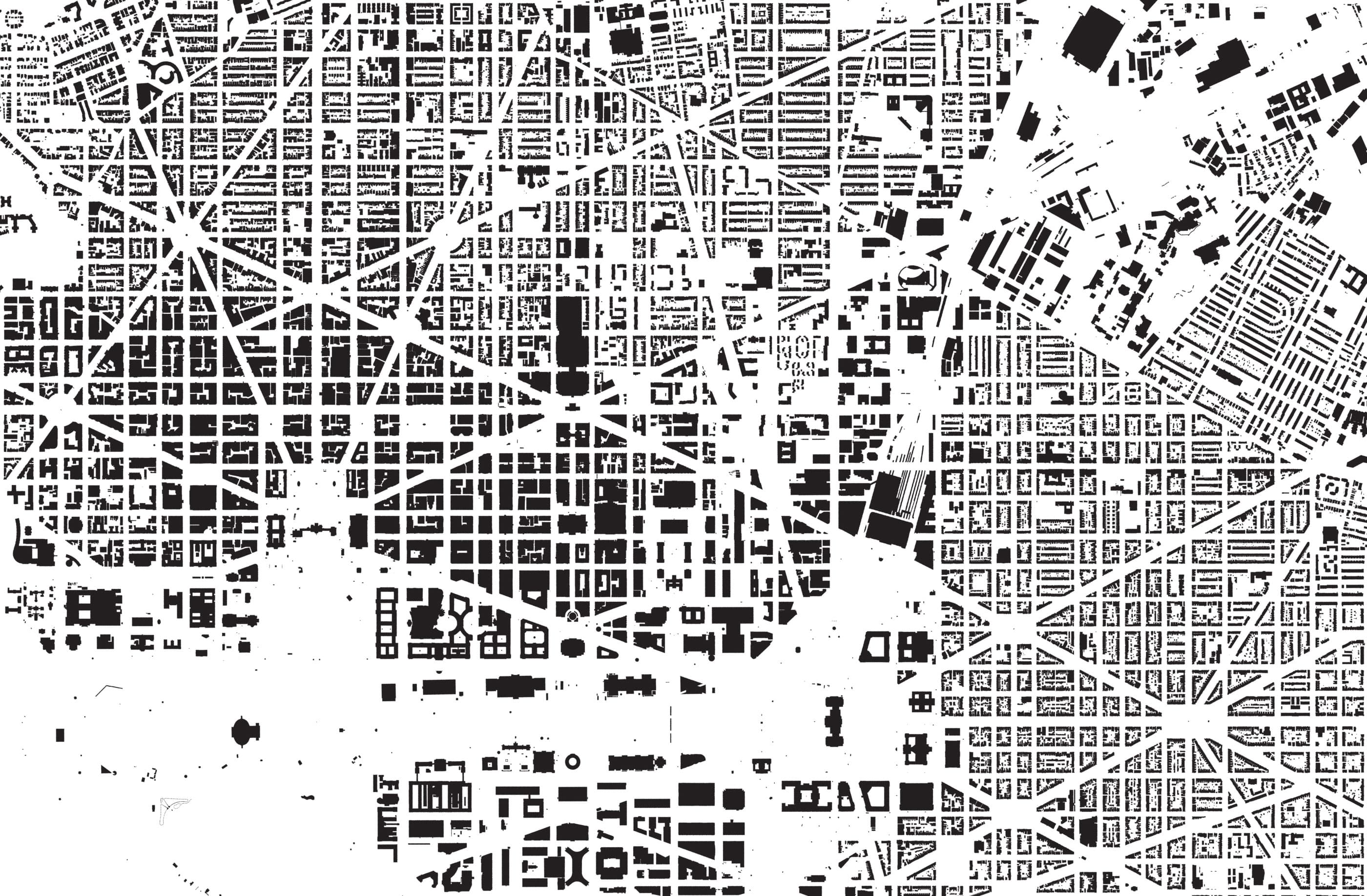 We found fascinating patterns in the arrangements of buildings. Traditional road maps highlight streets and highways; here they show up as a linear absence.