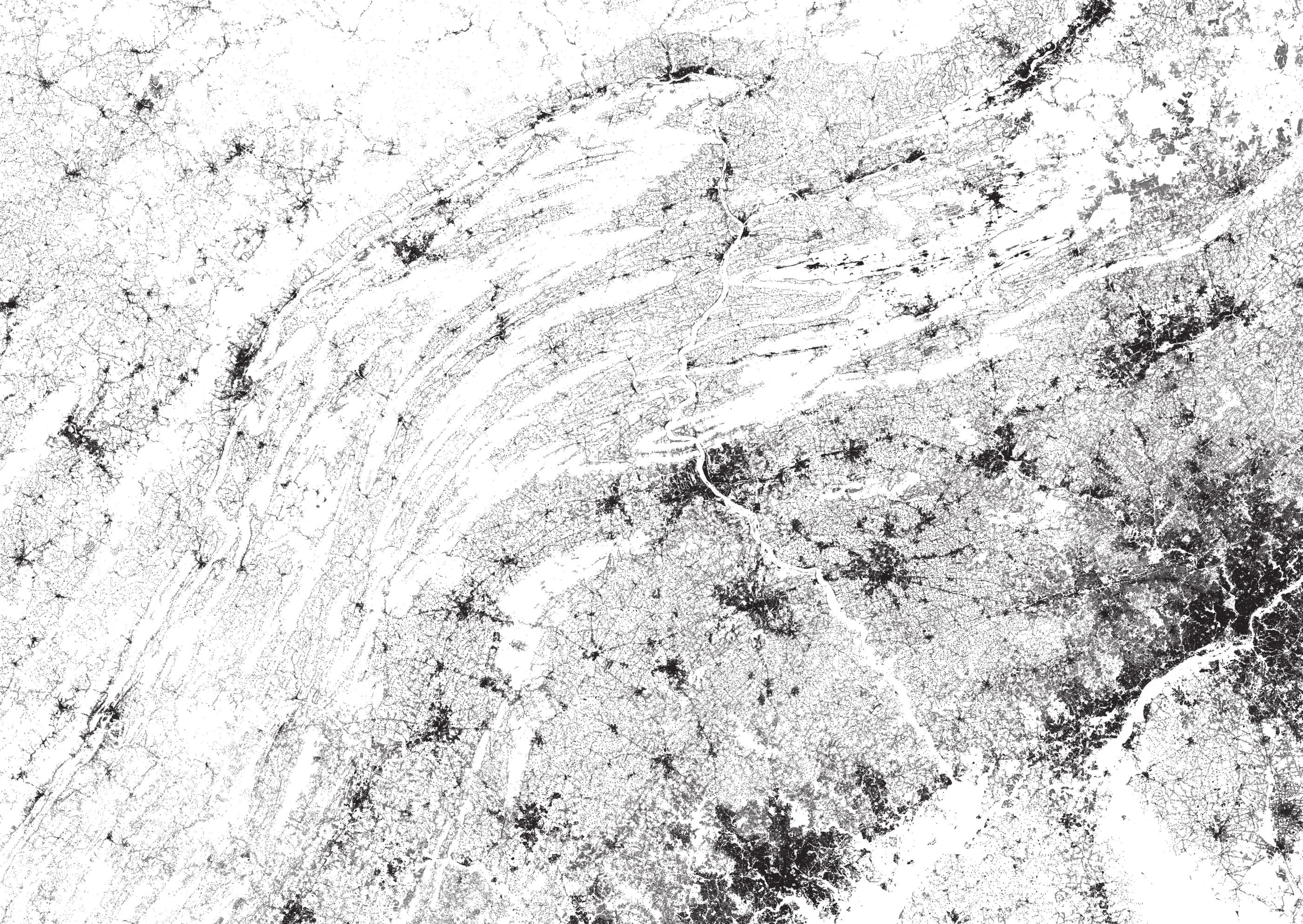 Where buildings are clustered together, in downtowns, the image is darker, dense. As suburbs stretch out with their larger lawns and malls, the map grows lighter. Your eye can follow the ways that development conforms to landscape features like water and slopes.