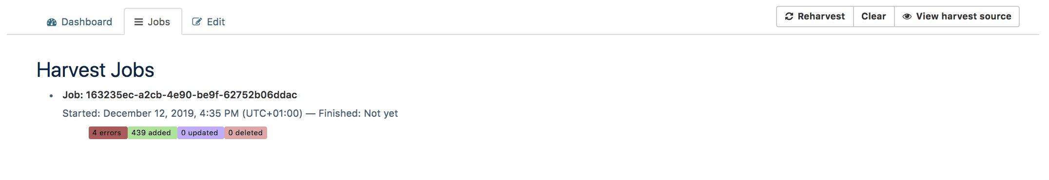 - Run and view harvests via API (and UI) and the background logging and monitoring to support that