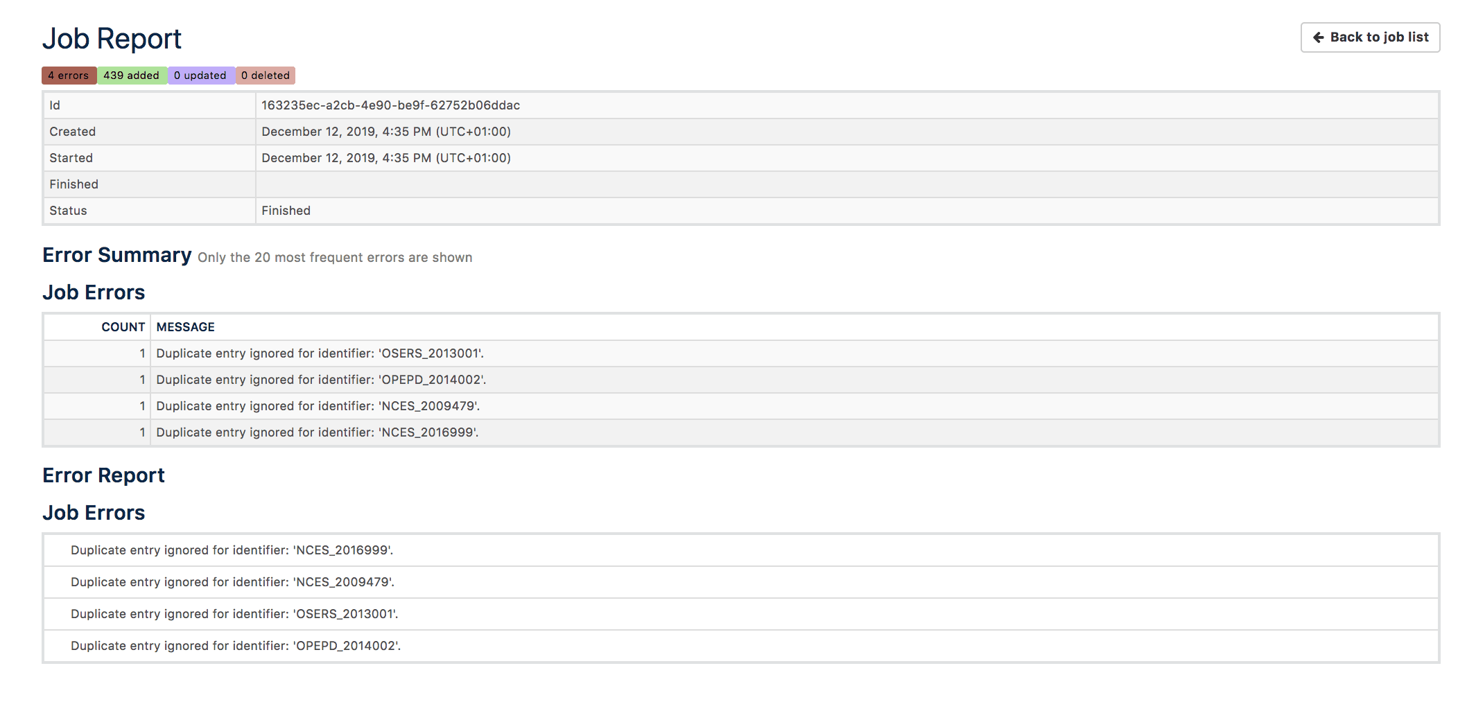 imported), "unchanged" if the object didn't need harvesting after