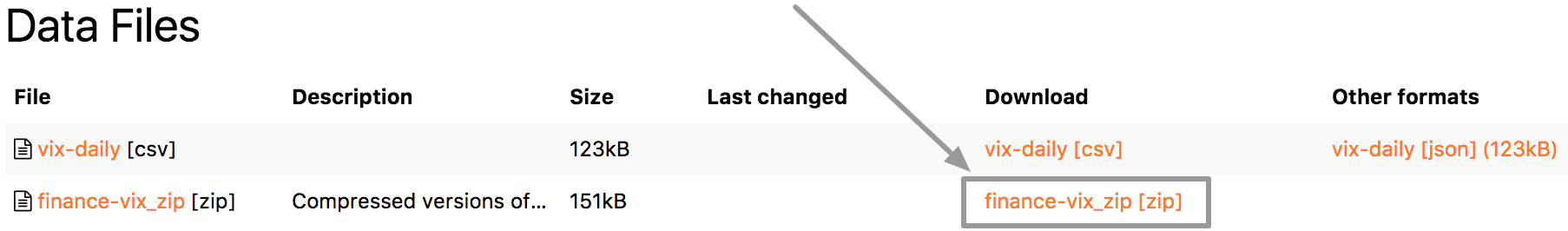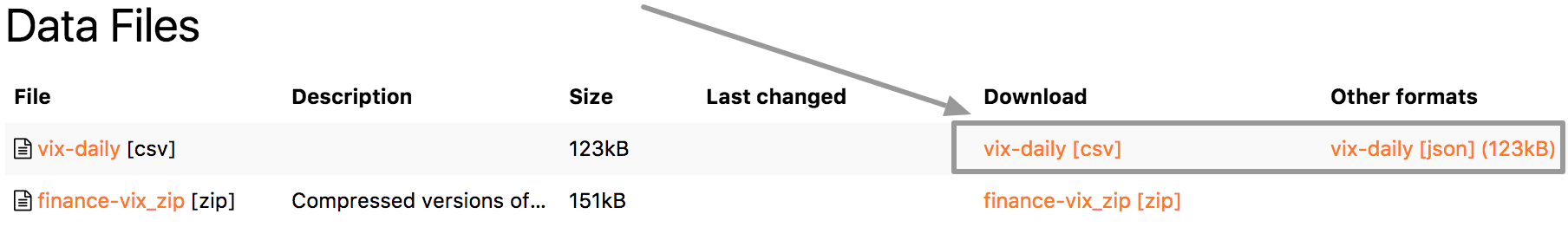 For tabular data we auto generate CSV and JSON versions. Again, if we use "finance-vix" example here, we can find download links for CSV and JSON: